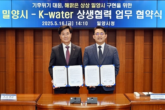 경남 밀양시와 한국수자원공사(K-water) 낙동강유역본부는 16일 시청 소회의실에서 '기후 위기 대응, 해맑은 상상 밀양시 구현을 위한 상생협력 업무협약'을 체결했다.