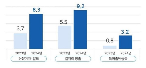 이번 점검은 2년간 총 191개 사업(2023년 96개, 2024년 95개)에 약 4237억 원의 연구개발 예산이 투입된 4대 분야, 10대 과제의 전략을 기준으로 이뤄졌다. 그 결과 △논문게재, △특허출원, △사업화, △일자리창출 등 전반적인 지표에서 성장세를 확인했다. 대표적으로 연구개발 시비 1억 원당 논문과 특허 성과가 전년 대비 2배 이상 증가했고 일자리 창출도 2배 가까이 증가하는 성과가 있는 것으로 나타났다.