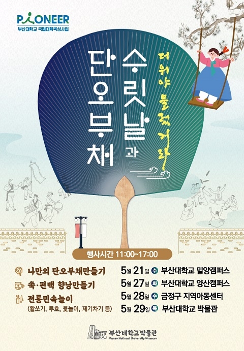 부산대학교 박물관은 단오(음력5.5., 올해 5.31.)를 맞아 '더위야 물렀거라! 수릿날과 단오부채' 행사를 통해 나만의 전통부채 만들기, 쑥·편백 향냥 만들기, 각종 민속체험 등을 무료로 마련해 오는 21일부터 29일까지 부산대 부산캠퍼스 및 양산·밀양캠퍼스와 금정구 소재 지역아동센터에서 개최한다고 20일 밝혔다.