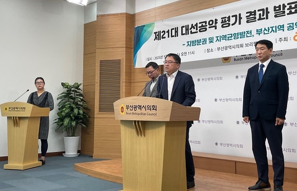부산경제정의실천시민연합(이하 부산경실련)이 제21대 대통령선거를 앞두고 더불어민주당, 국민의힘, 개혁신당 세 후보의 지방분권 및 지역균형발전, 부산지역 공약에 대한 평가 결과를 21일 발표했다. 이날 오전 부산시의회 브리핑룸에서 열린 기자회견에서 부산경실련은 “세 정당 모두 공약의 실현 가능성은 낮고 구체성이 부족하다”고 평가했다.