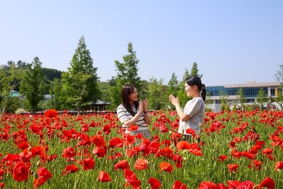 경남 진주시는 지역의 새로운 힐링 명소로 주목받고 있는 '두메실농업테마파크' 내 경관작물원에 꽃양귀비가 화려하게 피어 아름다운 경관을 연출하고 있다고 21일 밝혔다.