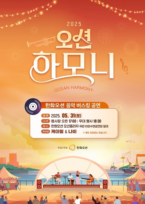 오션하모니는 거제 옥포동 소재 한화오션 오션플라자 뒤편 야외 수변공원 일대에서 펼쳐지는 소규모 버스킹 음악·문화 공연이다. 22일 한화오션에 따르면 바다를 품은 한화오션의 야드를 배경으로 다양한 장르의 공연이 오는 31일 진행될 예정이다.