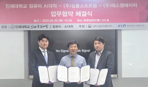 인제대학교 컴퓨터·AI대학 및 SW중심대학사업단은 지난 20일 ㈜심플소프트랩, ㈜에스엠에이치와 스마트물류 혁신인재 양성을 위한 업무협약을 체결했다고 23일 밝혔다.
