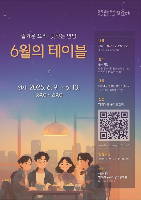 부산 해운대구가 청년 1인가구를 위한 특별한 소셜다이닝 프로그램 ‘6월의 테이블’을 오는 6월 9일부터 13일까지 총 5회에 걸쳐 운영한다. 이번 프로그램은 청년들이 함께 요리를 배우고 식사를 나누며 소통할 수 있도록 기획된 자리로, 총 80여 명이 참여할 예정이다.