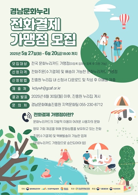 경남문화예술진흥원은 경남 도내 소외지역 거주자나 고령자 등 거동이 불편한 문화누리카드 이용자에게 다양한 이용 혜택을 누릴 수 있도록 문화누리카드 전화결제 가맹점을 내달 20일까지 모집한다고 28일 밝혔다.