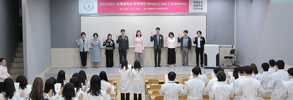 인제대학교 약학대학은 지난 27일 약학관 대강당에서 화이트코트 세레모니를 열어 실무실습을 앞둔 5학년 재학생 31명의 새로운 출발을 격려했다고 28일 밝혔다.