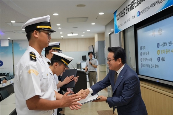한국해양진흥공사가 28일 부산해사고등학교에서 미래 해양 인재 육성을 위한 장학금 수여식을 열고, 해기 인력난 해소에 본격 나섰다.