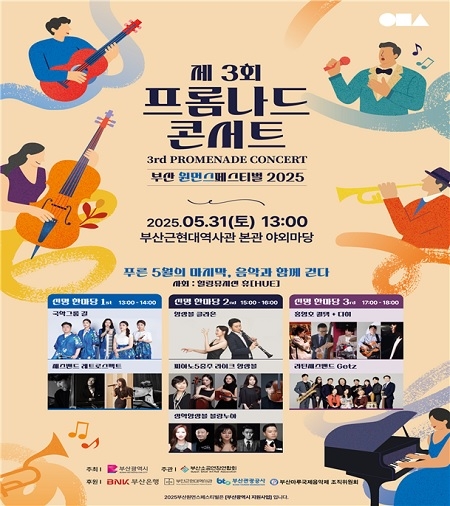 같은 날 오후에는 ‘프롬나드 콘서트’가 역사관 본관 야외마당에서 열린다. 이번 콘서트는 '부산 원먼스페스티벌 20205'의 일환으로 진행되는 이번 음악회는 역사문화 공간과 음악이 어우러지는 특별한 야외 행사로, 클래식, 국악, 재즈, 크로스오버 등 다양한 장르의 무대로 남녀노소 모두가 즐길 수 있는 음악축제로 자리매김하고 있다. 푸르른 5월의 바람과 함께하는 이 음악회는 시민들에게 쉼과 감동을 선사하며, 지역 예술인과 협업한 감성적인 공연으로 꾸며질 예정이다.