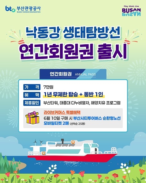 한편 이번에 출시된 ‘낙동강 생태탐방선 연간회원권’은 단 한 번의 이용만으로도 59600원의 할인 혜택을 받을 수 있는 높은 경제성을 갖춘 상품이다. 라이브커머스 방송 이후에는 총 500매 한정으로 네이버 스마트스토어를 통해 오는 30일까지 판매된다.