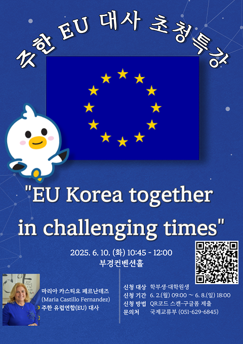 국립부경대학교는 10일 오전 10시 45분 부경컨벤션홀에서 마리아 카스티요 페르난데즈 주한유럽연합(EU) 대사 초청 특강을 개최한다고 밝혔다.