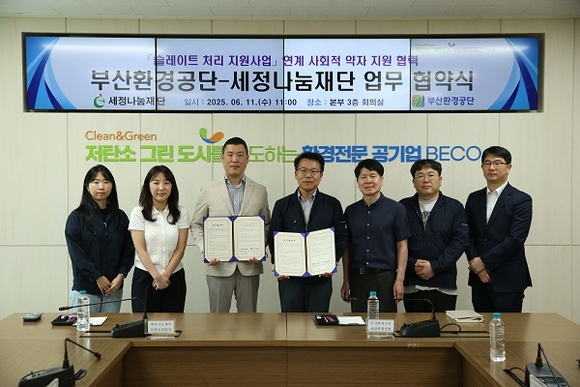 부산환경공단이 11일 공단 본부에서 세정나눔재단과 취약가정 슬레이트 철거 지원을 위한 협약을 체결했다고 전했다. 이번 협약은 경제적 부담으로 석면 슬레이트 지붕 철거와 개량 신청을 포기하는 시민의 부담을 덜어주고 안전한 시민 주거환경을 조성하기 위해 체결됐다.