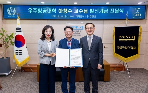 경상국립대학교는 글로컬대학사업단 우주항공대학 하창수 산학협력중점교수가 대학발전기금 1000만 원을 출연했다고 12일 밝혔다. 발전기금 전달식은 지난 11일 오후 대학본부 3층 접견실에서 마련됐다.