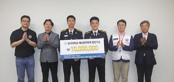 기부금 1000만 원은 올해 2월 동아대 대학원 재난관리학과를 졸업하고 학위를 받은 박철우·배진모 박사, 백승창·최기원 석사가 마련한 400만 원에 이동규 책임교수가 특허 재난기술 사업화 수익 및 저서 인세 600만 원을 보태 완성됐다.