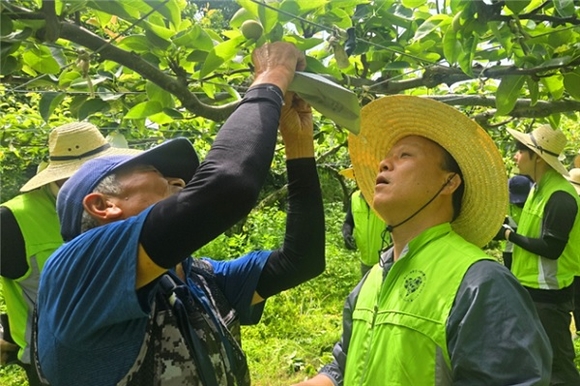 이날 현장에는 김석빈 경영본부장, 임재선 도시기반본부장을 비롯해 본사 간부진과 각 실·처·원 소속 직원들이 자발적으로 참여했다. 봉사단은 과실 해충 피해를 줄이기 위한 싸개 씌우기 작업과 농가 시설물 안전 점검 등 실질적인 작업을 수행하며 농번기 일손 부족 해소에 힘을 보탰다.