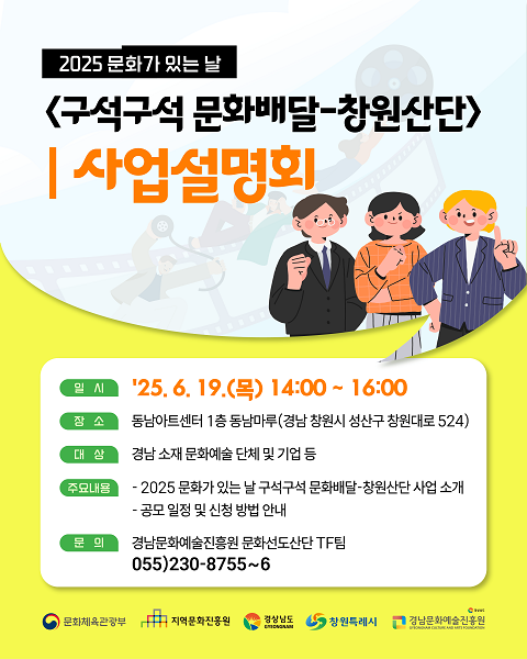 경남문화예술진흥원이 ‘2025 문화가 있는 날 구석구석 문화배달-창원산단’ 사업의 프로그램 운영 단체를 공개 모집하며, 오는 19일 사업 설명회를 갖는다고 18일 밝혔다.
