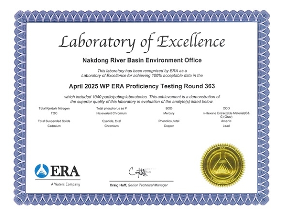 낙동강유역환경청은 올해 국제숙련도 시험에서 수질, 먹는물, 토양 분야에서 49개 항목에 대한 '적합' 판정을 받아 최우수 연구실(Laboratory of Excellence) 인증서를 획득했다고 18일 밝혔다.