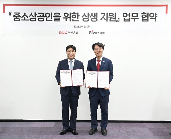 BNK부산은행이 20일 부산은행 서울업무부에서 전자상거래 전문기업 ㈜비즈마켓 함께 ‘중소상공인을 위한 상생 지원’을 위한 업무협약을 체결했다고 밝혔다.
