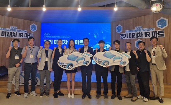 20일 열린 2025 지역특화 프로젝트 레전드 50+ 경기 미래차 IR마트에서 관계자들이 기념촬영을 하고있다.(사진=중진공 제공)