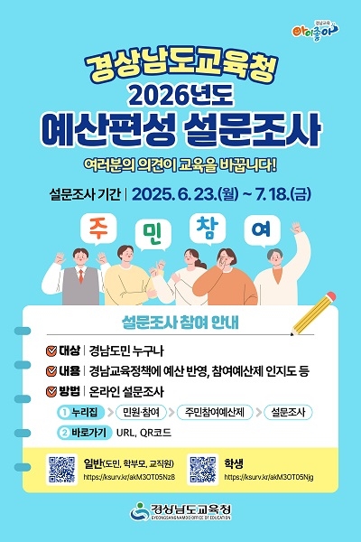 경남도교육청이 2026년도 교육 예산 편성을 앞두고, 학생·학부모·교직원·도민 등을 대상으로 오는 23일부터 7월 18일까지 설문 조사를 진행한다.