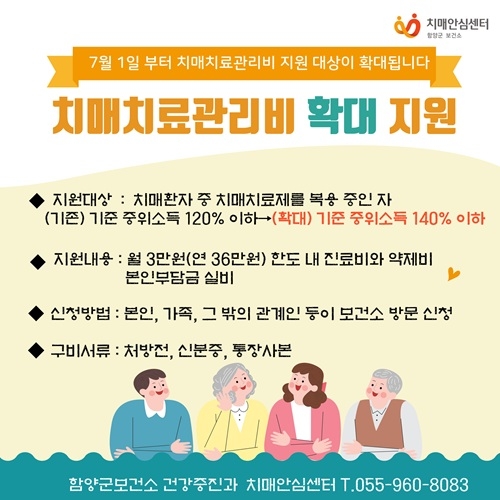 경남 함양군은 오는 7월부터 치매 환자를 위한 치료관리비 지원 기준을 기존 중위소득 120% 이하에서 140% 이하로 확대 시행한다고 23일 밝혔다.