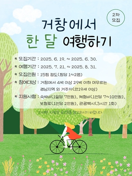 이번 프로그램은 7월 21일부터 8월 31일까지 진행되며, 4박부터 최대 29박 이내의 일정으로 거창에 머무는 참가자들에게 팀당 1일 최대 7만 원의 숙박비가 지원된다. 또한 참가자 1인당 7만 원∼10만 원의 체험비와 2만 원 이내의 보험료도 지원한다.