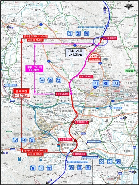 무계~삼계 우회도로 건설사업은 장유동 응달에서 삼계동까지 총 13.76km를 연결하는 총사업비 4772억원 규모 공사로 지난 2008년 3월 착공해 작년 10월 주촌교차로~삼계교차로 구간을 부분 개통하고 올해 12월 전체 구간 개통을 목표로 하고 있다.