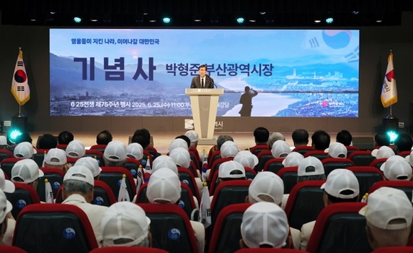 부산시가 25일 시청 대강당에서 '영웅들이 지킨 나라, 이어나갈 대한민국'을 주제로 6·25전쟁 제75주년 기념식을 개최했다. 이번 행사는 6·25전쟁의 역사적 의미를 되새기고 참전유공자의 숭고한 희생과 헌신을 기리기 위해 마련됐다.