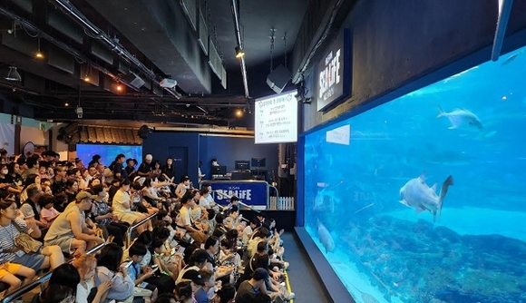 국내 유일 상어먹이주기 공연을 관람하는 관람객들.(사진=부산 아쿠아리움 제공)