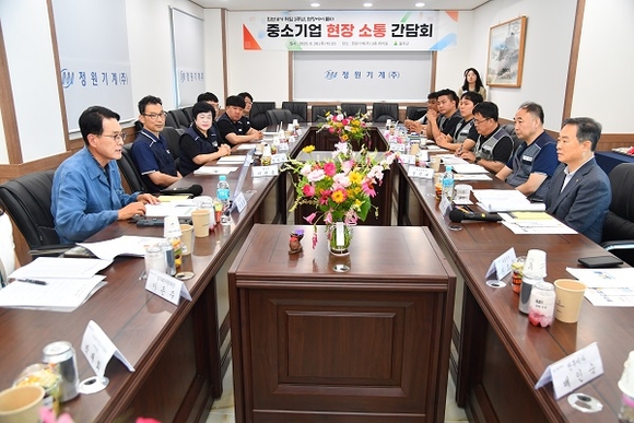 울산 울주군이 26일 언양읍 반천산업단지에 위치한 정원기계(주)에서 이순걸 군수를 비롯해 원경연 회장과 근로자 20명이 참여한 가운데 중소기업 현장소통 간담회를 개최했다.