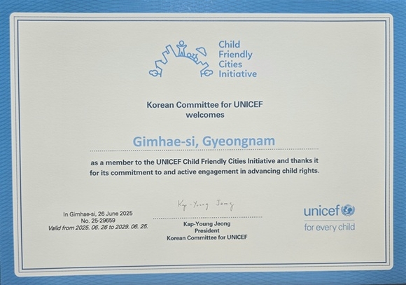 인증 기간은 지난 26일부터 2029년 6월 25일까지 4년이며, 향후 4년간 국내외 유니세프 아동친화도시와 협력사업을 진행하고 유니세프의 전문적인 지원과 자문을 받을 수 있게 된다. 김해시 최초 인증은 지난 2021년 2월이다.