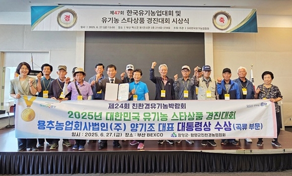 경남 함양군은 27일 '2025년 대한민국 유기농 스타상품 경진대회'에서 안의면 용추농업회사법인(주) 양기조 대표가 생산한 용추쌀(백미)이 대통령상을 수상하며, 함양군 친환경 농산물의 우수성을 입증했다고 밝혔다.