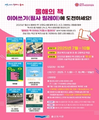 참여 기관 모집은 7월 1일 오후 5시부터 울산도서관 누리집을 통해 선착순으로 진행된다. 자세한 문의는 울산도서관 자료정책과(☎052-229-6901)로 하면 된다.