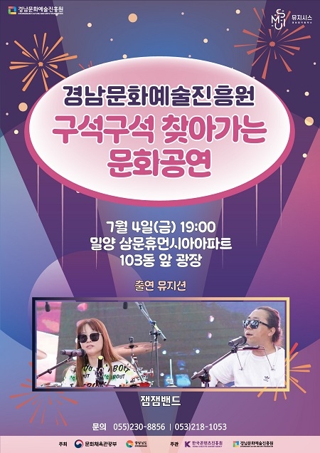 경남도와 (재)경남문화예술진흥원이 내달 4일 오후 7시 밀양 삼문휴먼시아에서 입주민들을 대상으로 지역연계 공연 프로그램 '구석구석 찾아가는 문화공연'을 개최한다고 30일 밝혔다.