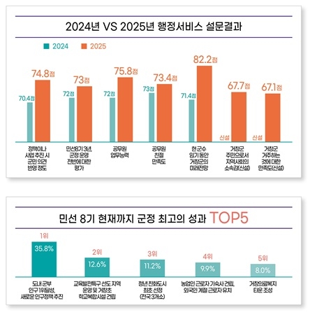 한편 민선 8기 군정의 미래 전망에 대한 군민 평가 결과, '좋아질 것'이라는 응답이 전년도 71.4%에서 82.2%로 상승해, 군정 운영에 대한 군민 만족도와 신뢰가 매우 높은 것으로 나타났다.