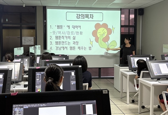 경남문화예술진흥원은 지난 1일 경남웹툰캠퍼스 1층 웹툰교육실에서 대산중학교 1학년 학생 51명을 대상으로 웹툰 분야 진로체험 교육 프로그램을 진행했다고 2일 밝혔다.