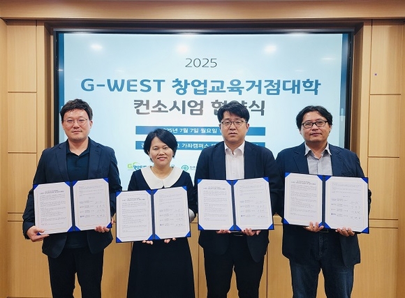 경상국립대학교 창업지원단은 지난 7일 대학본부 회의실에서 진주보건대학교, 연암공과대학교, 거제대학교와 함께 ‘경남RISE G-WEST 창업교육거점대학 컨소시엄 업무협약(MOU)’을 체결했다고 8일 밝혔다.