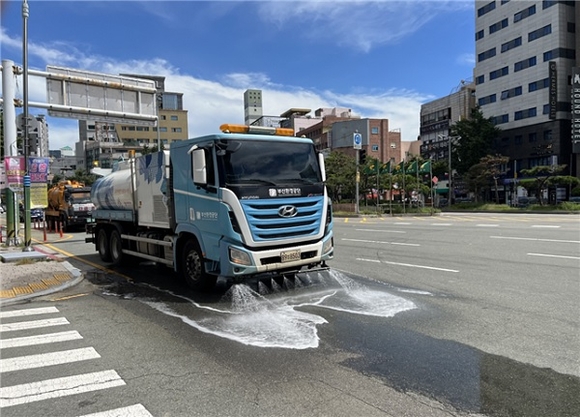 부산환경공단이 연이은 폭염특보에 따라 도로 물청소차량 4대를 총동원해 주요 간선도로를 중심으로 살수작업을 실시하고 있다고 9일 밝혔다. 이번 조치는 폭염으로 인한 도심 열섬현상을 완화하고, 시민 건강 보호를 위한 비상운영체제의 일환이다.
