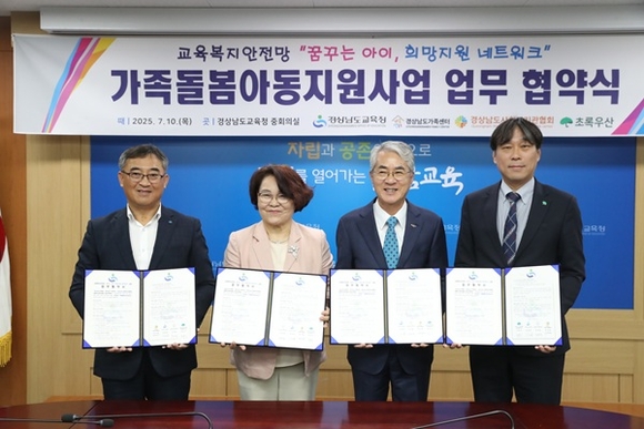 경남도교육청은 10일 도교육청 중회의실에서 경남도가족센터, 경남도사회복지관협회, 초록우산어린이재단 경남본부와 함께 '교육복지안전망 가족돌봄아동 지원사업' 업무협약을 체결했다.