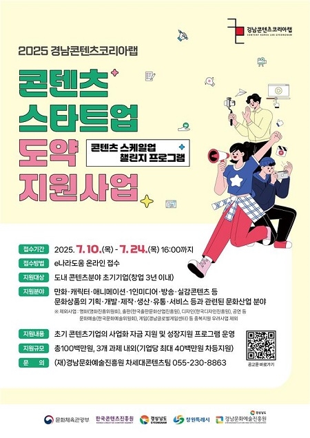 경남문화예술진흥원은 경남도와 운영하는 경남콘텐츠코리아랩에서 유망 콘텐츠 초기 창업기업의 안정적인 성장과 도내 창업 생태계 활성화를 목표로 ‘2025 콘텐츠 스케일업 챌린지 프로그램’을 내달부터 본격 추진한다고 14일 밝혔다.