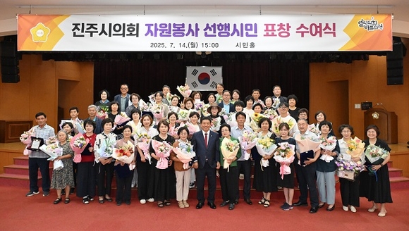 진주시의회는 14일 진주시청 시민홀에서 '2025년 상반기 자원봉사 선행 시민 표창 수여식'을 열어 지역사회 발전과 나눔문화 확산에 기여한 시민 60명에게 감사의 뜻을 표했다.