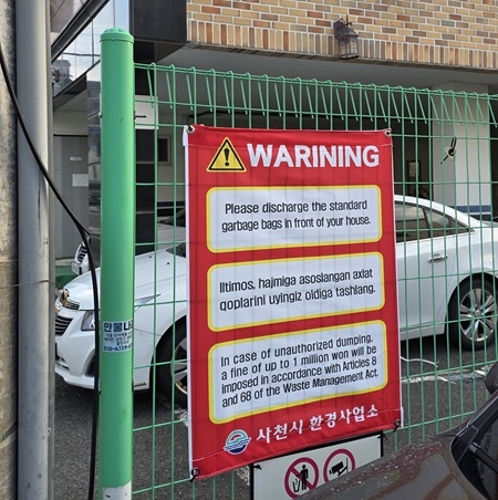 사천시는 관내 외국인 주민의 쓰레기 분리배출 인식 개선과 불법투기 예방을 위해 외국인 밀집 거주지역인 사천읍에 영어·우즈벡어 등 2개 국어로 표기한 현수막을 설치했다고 15일 밝혔다.