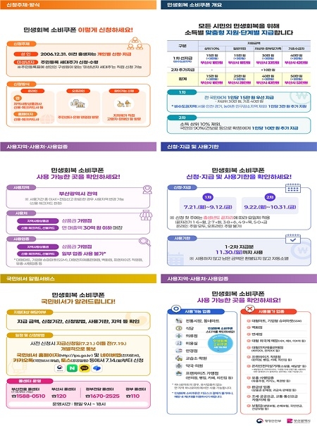 부산시가 오는 21일부터 9월 12일까지 시민 체감형 경기 부양 대책의 일환으로 ‘민생회복 소비쿠폰’ 1차 지급을 시작한다고 17일 밝혔다. 이번 조치는 지난 7월 5일 정부가 발표한 민생회복 소비쿠폰 지급 계획에 맞춰 추진되는 것으로, 지역 소비 진작과 민생경제 활력 제고를 목적으로 한다.