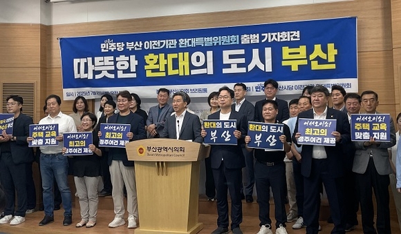 더불어민주당 부산시당이 21일 부산시의회 브리핑룸에서 기자회견을 열고 ‘부산이전기관 환대특별위원회’ 출범을 공식화하며 해양수산부 등 부산으로 이전하는 중앙기관의 안정적인 정착을 위한 본격적인 지원에 나선다고 밝혔다.
