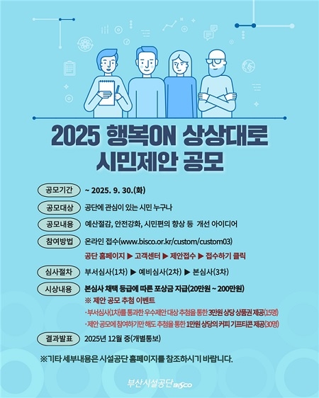 부산시설공단이 시민이 직접 체감할 수 있는 공공서비스 혁신을 위해 오는 9월 30일까지 ‘행복ON 상상대로’ 제3기 시민 체감형 개선 아이디어 공모전을 진행한다고 밝혔다.