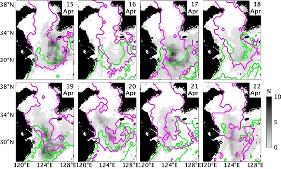이에 따라 KIOST 해양순환기후연구부 서성봉 박사 연구팀은 천리안해양관측위성 1호(GOCI) 및 2B호(GOCI-II)의 관측자료와 KIOST 자체 개발 입자 추적 모형을 활용해 괭생이모자반의 이동 경로 및 대량 유입 원인을 분석했다.