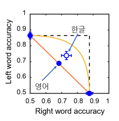 이는 여러 글자를 ‘이어쓰기’로 단어를 만드는 영어와 달리 자모를 ‘모아쓰기’해 단어를 구성하는 한글의 쓰기 체계, 음운 소리와 글자가 거의 일대일로 대응되는 음절구조, 규칙적인 철자법 등의 차이가 두 단어에 효율적으로 주의를 할당하는 데 큰 역할을 했음을 시사한다.
