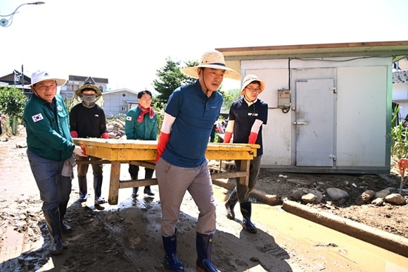 오후에는 신안면 야정마을을 방문했다. 이 마을은 주택과 도로 등 마을 전체가 침수돼 전기와 수도마저 끊기는 등 피해가 심각한 곳이다. 최 의장 일행은 전쟁터와도 같은 피해 실상을 직접 확인하고, 극심한 무더위에 제대로 씻지도 못하고 탈진한 마을 주민들을 만나 위로를 전했다.
