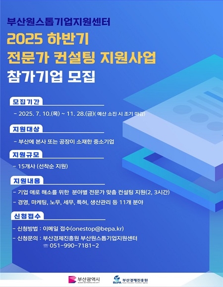 부산경제진흥원 원스톱기업지원센터가 지역 기업의 애로 해소와 활력 제고를 위해 '2025년 하반기 기업애로 전문가 컨설팅 지원사업'을 추진한다고 28일 밝혔다.