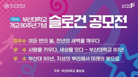 부산대학교가 내년 2026년 개교 80주년을 기념해 전 국민을 대상으로 개최한 ‘부산대학교 80주년 슬로건 공모전’이 대학 구성원은 물론 시민들의 뜨거운 관심과 참여 속에 성료됐다.