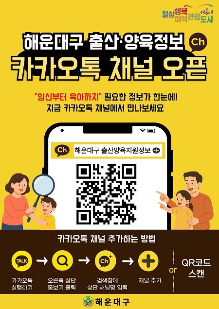 카카오톡 채널은 카카오톡 앱에서‘해운대구출산양육지원정보'를 검색하거나 QR코드를 스캔해 간편하게 추가할 수 있다.